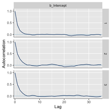 The bayesplot::mcmc_acf() function will give us the autocorrelation plots.