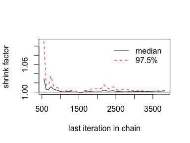 ## scale reduction factor on split chains (at convergence, Rhat = 1).