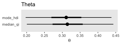 To summarize a posterior in terms of central tendency, brms defaults to the mean value (i.e., the value in the ‘Estimate’ column of the print() output). In many of the other convenience functions, you can also request the median instead. For example, we can use the robust = T argument to get the ‘Estimate’ in terms of the median.