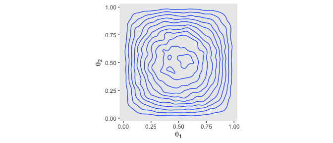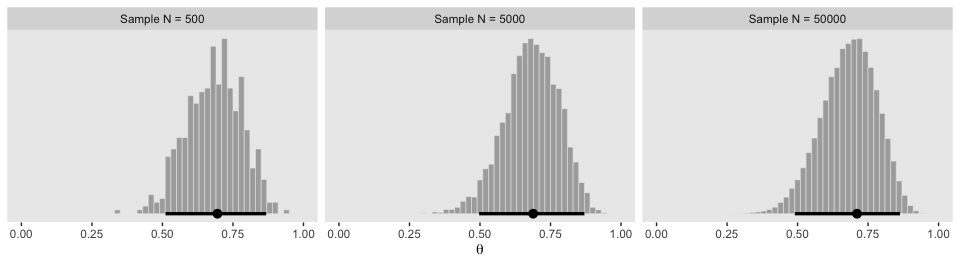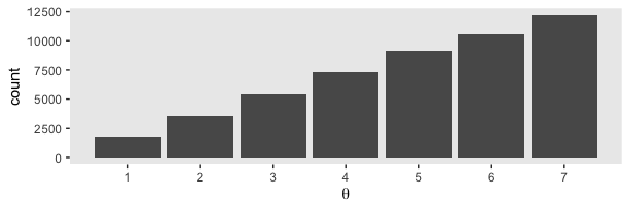 If you wanted a better sense of the phenomena, you could do a simulation. We’ll make a custom simulation function to compute the modes from many random draws from our \(\text{beta} (\theta | 15, 7)\) distribution, with varying \(N\) values.