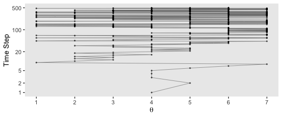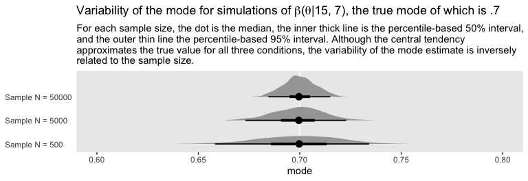 labs(title = expression(paste("Variability of the mode for simulations of ", beta, "(", theta, "|15, 7), the true mode of which is .7")),