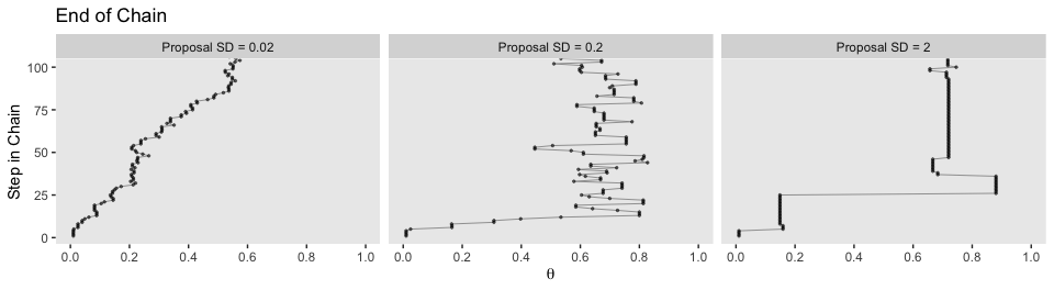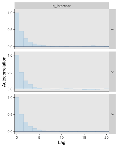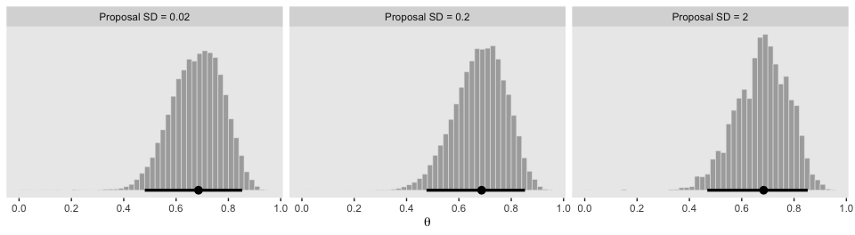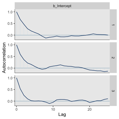 Kruschke wrote: “It is often the case in realistic applications that there is strong autocorrelation for some parameters, and therefore, an extremely long chain is required to achieve an adequate ESS or MCSE” (p. 187). As we’ll see, this is generally less of a problem for HMC than for MH or Gibbs. But it does still crop up, particularly in complicated models. As he wrote on the following page, “one sampling method that can be relatively efficient is Hamiltonian Monte Carlo.” Indeed.