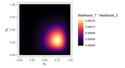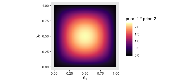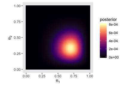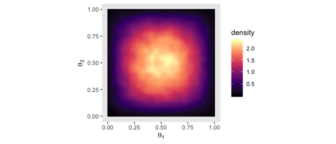 To get the density in the upper left panel of Figure 7.1, we’ll make use of dbeta(). And we’ll also make use of our h[1:2] and omega values.