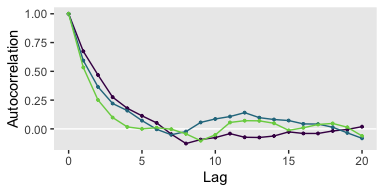 All three rows of our versions for Figure 7.12 indicate in their own way how much lower our autocorrelations were than the ones in the text.