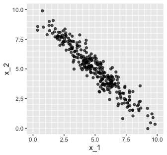For Figure 18.2, the \(x\) variables look to be multivariate normal with a correlation of about -.95. We can simulate such data with help from the MASS package.