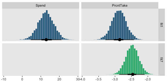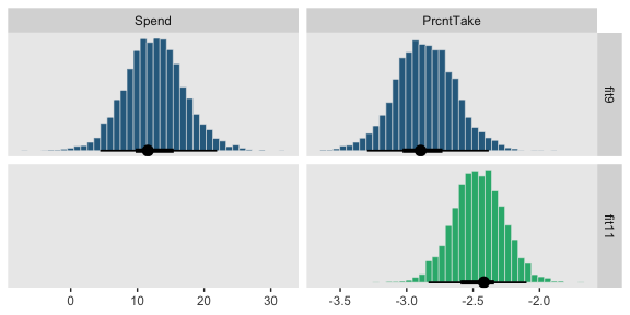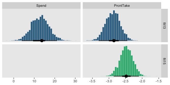 This is a good place to emphasize how priors in brms are given classes. If you’d like all parameters within a given class to have the prior, you can just specify one prior argument within that class. For our fit1, both parameters of class = b have a normal(0, 2) prior. So we can just include one statement to handle both. Had we wanted different priors for the coefficients for spend_z and prcnt_take_z, we’d need to include two prior() arguments with at least one including a coef argument.