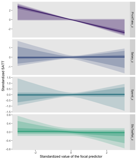 In each panel of the plot, below, we focus on one predictor. For that predictor, we hold all other three at their mean, which, since they are all standardized, is zero. We consider the posterior predictions for standardized SAT scores across a range of values each focal predictor. The posterior predictions are depicted in terms of 95%, 80%, and 50% percentile-based interval bands and a line at the median.
