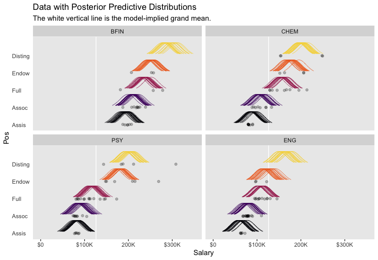 As was explained in Section 19.2 (p. 556), the terminology, “analysis of variance,” comes from a decomposition of overall data variance into within-group variance and between-group variance… The Bayesian approach is not ANOVA, but is analogous to ANOVA. Traditional ANOVA makes decisions about equality of groups (i.e., null hypotheses) on the basis of \(p\) values using a null hypothesis that assumes (i) the data are normally distributed within groups, and (ii) the standard deviation of the data within each group is the same for all groups. The second assumption is sometimes called “homogeneity of variance.” The entrenched precedent of ANOVA is why basic models of grouped data make those assumptions, and why the basic models presented in this chapter will also make those assumptions. Later in the chapter, those constraints will be relaxed. (pp. 587–588)