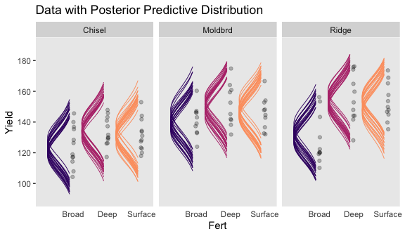 Kruschke then posed a model “with field/subject coding suppressed, hence no lines connecting data from the same field/subject” (p. 616). Here’s how to fit that model.