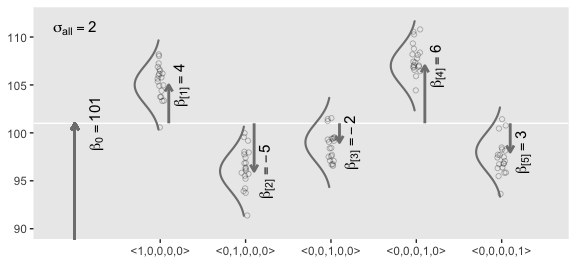 label = c("beta[0] == 101", "beta['[1]'] == 4", "beta['[2]'] == -5", "beta['[3]'] == -2", "beta['[4]'] == 6", "beta['[5]'] == 3", "sigma['all'] == 2"))