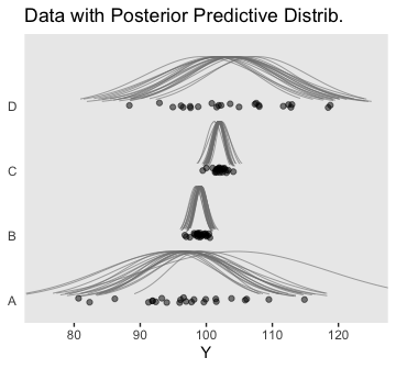 Here we’ll make a tibble containing the necessary data for the rotated Gaussians. As far as I can tell, Kruschke’s Gaussians only span to the bounds of percentile-based 98% intervals. We partition off those bounds for each group by the ll and ul columns in the first mutate() function. In the second mutate(), we expand the dataset to include a sequence of 100 values between those lower- and upper-limit points. In the third mutate(), we feed those points into the dnorm() function, with group-specific means and a common sd.
