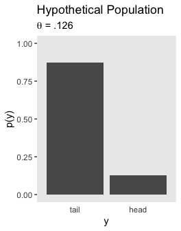 The logic of conventional NHST goes like this. Suppose the coin is fair (i.e., \(\theta\) = 0.50). Then, when we flip the coin, we expect that about half the flips should come up heads. If the actual number of heads is far greater or fewer than half the flips, then we should reject the hypothesis that the coin is fair. To make this reasoning precise, we need to figure out the exact probabilities of all possible outcomes, which in turn can be used to figure out the probability of getting an outcome as extreme as (or more extreme than) the actually observed outcome. This probability, of getting an outcome from the null hypothesis that is as extreme as (or more extreme than) the actual outcome, is called a “\(p\) value.” If the \(p\) value is very small, say less than 5%, then we decide to reject the null hypothesis.