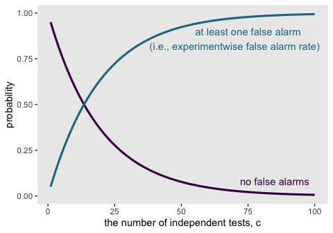 In NHST, we have to take into account all comparisons we intend for the whole experiment. Suppose we set a criterion for rejecting the null such that each decision has a “per-comparison” (PC) false alarm rate of \(\alpha_\text{PC}\), e.g., 5%. Our goal is to determine the overall false alarm rate when we conduct several comparisons. To get there, we do a little algebra. First, suppose the null hypothesis is true, which means that the groups are identical, and we get apparent differences in the samples by chance alone. This means that we get a false alarm on a proportion \(\alpha_\text{PC}\) of replications of a comparison test. Therefore, we do not get a false alarm on the complementary proportion \(1 - \alpha_\text{PC}\) of replications. If we run c independent comparison tests, then the probability of not getting a false alarm on any of the tests is \((1 - \alpha_\text{PC})^c\). Consequently, the probability of getting at least one false alarm is \(1 - (1 - \alpha_\text{PC})^c\). We call that probability of getting at least one false alarm, across all the comparisons in the experiment, the “experimentwise” false alarm rate, denoted \(\alpha_\text{EW}\). (pp. 325–326, emphasis in the original)
