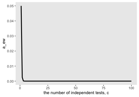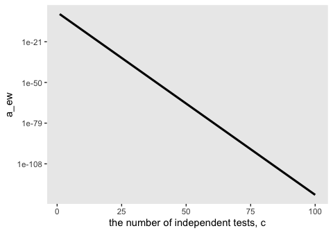 Again, it might be useful to plot the consequence of Bonferonni’s correction on \(\alpha\) for different levels of \(c\).