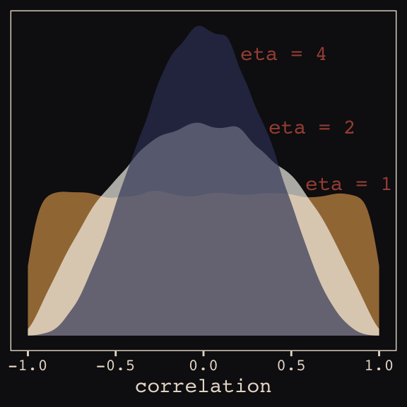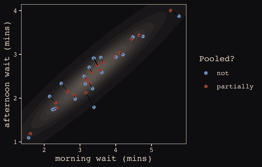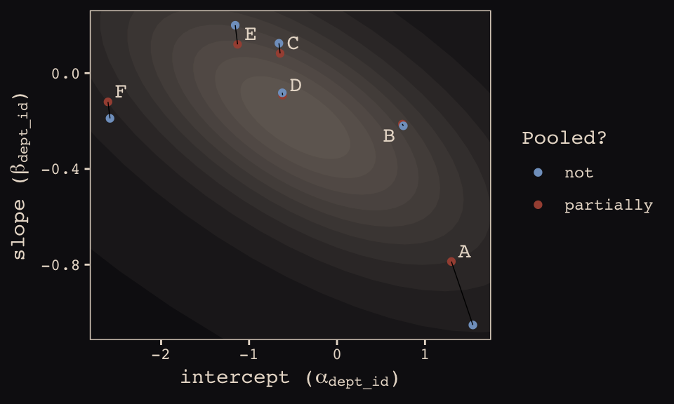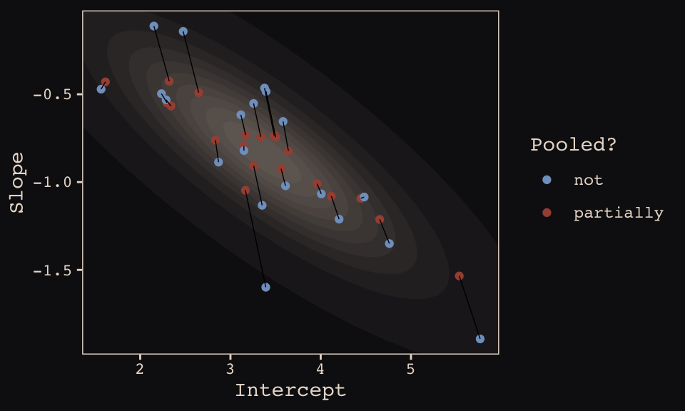 How should the robot pool information across intercepts and slopes? By modeling the joint population of intercepts and slopes, which means by modeling their covariance. In conventional multilevel models, the device that makes this possible is a joint multivariate Gaussian distribution for all of the varying effects, both intercepts and slopes. So instead of having two independent Gaussian distributions of intercepts and of slopes, the robot can do better by assigning a two-dimensional Gaussian distribution to both the intercepts (first dimension) and the slopes (second dimension). (p. 389)