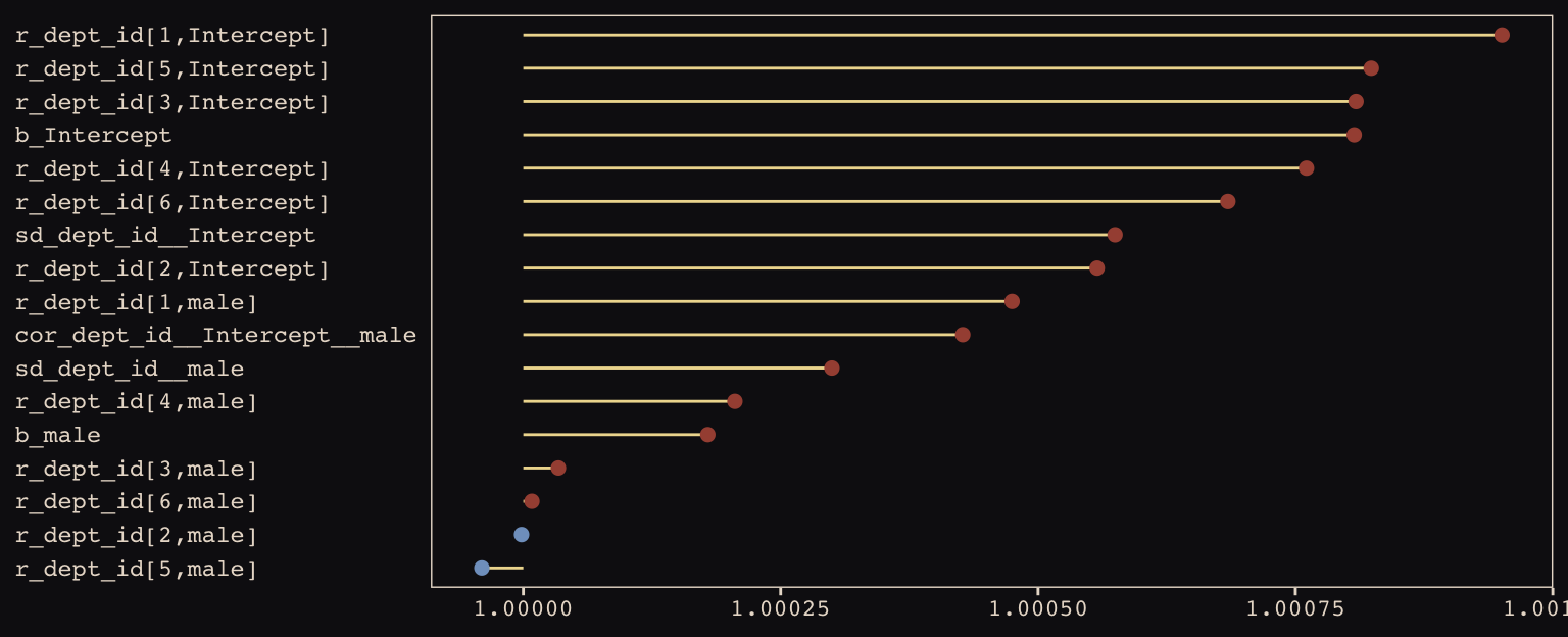 So, the estimate of the gender bias is small and consistent with the null hypothesis. Which is good! We want gender equality for things like funding success.