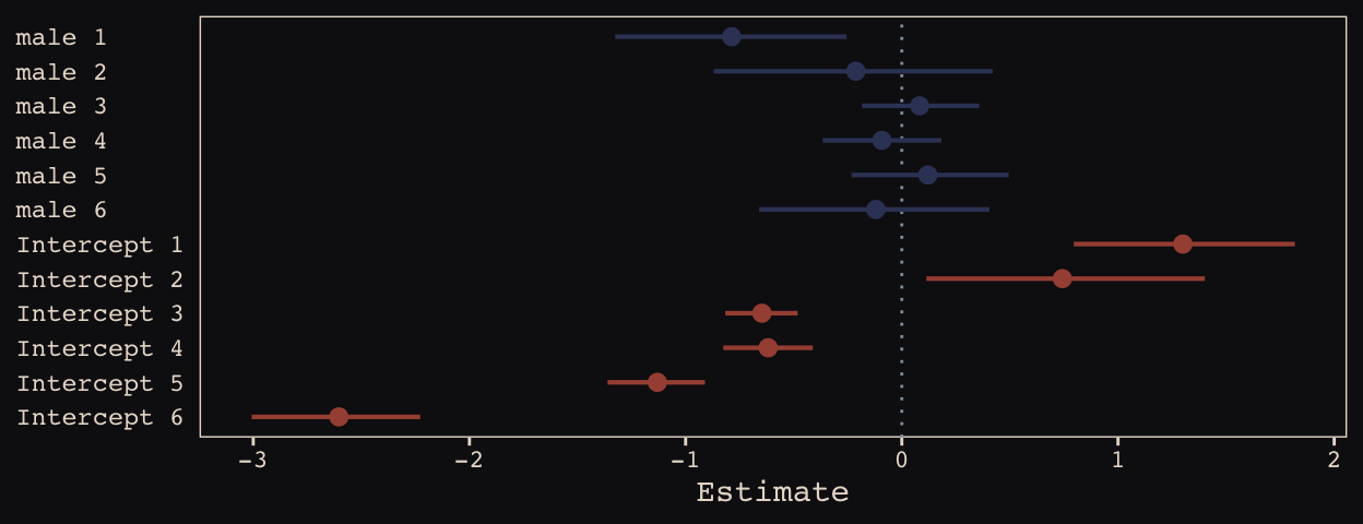 Note how the 95% intervals for all the random male slopes contain zero within their bounds. Here are the fixed effects: