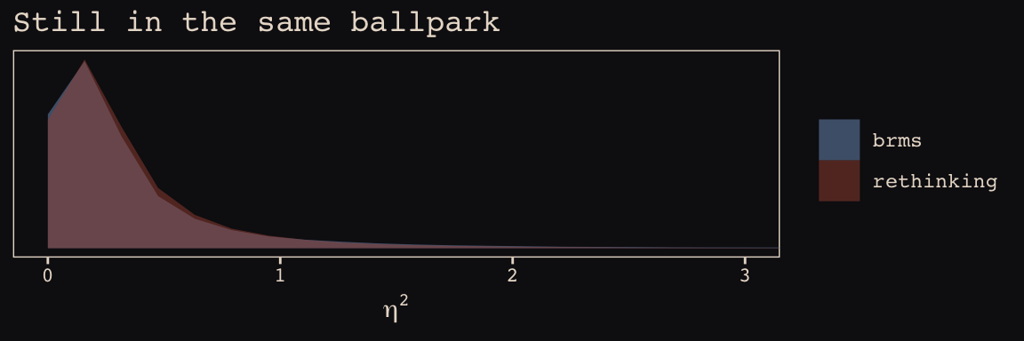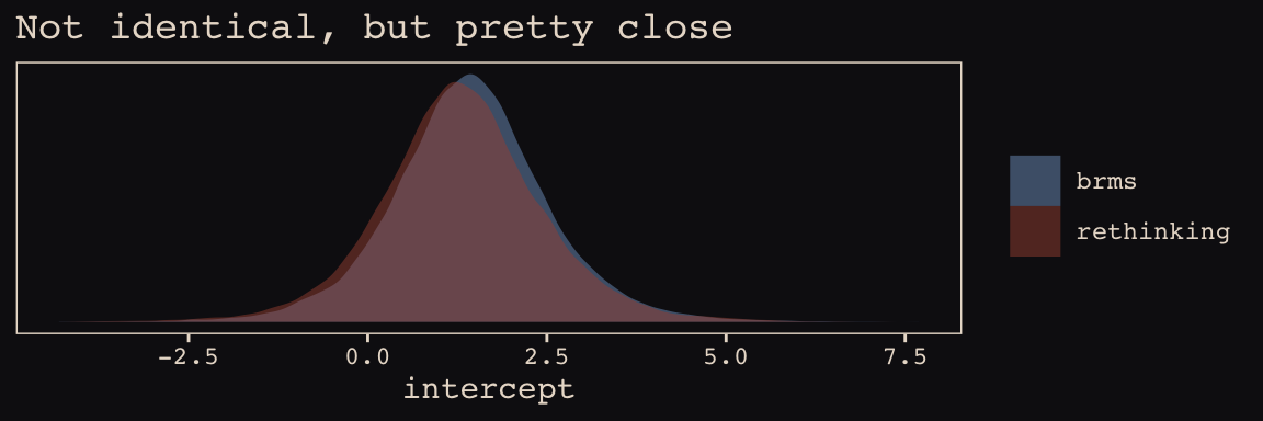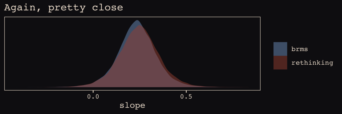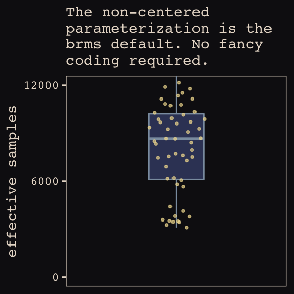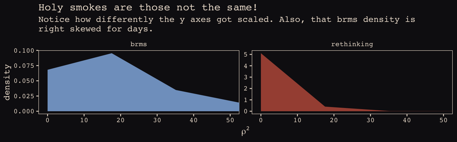 In the Rethinking: Why Gaussian? box, McElreath discussed how researchers might use other multivariate distributions to model multiple random effects. The only one he named as an alternative to the Gaussian was the multivariate Student’s \(t\). As it turns out, brms does currently allow users to use multivariate Student’s \(t\) in this way. For details, check out this discussion in the brms GitHub page. Bürkner’s exemplar syntax from his comment on May 13, 2018, was y ~ x + (x | gr(g, dist = "student")). I haven’t experimented with this, but if you do, do consider commenting on how it went.