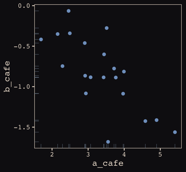 Let’s make sure we’re keeping this all straight. a_cafe = our café-specific intercepts; b_cafe = our café-specific slopes. These aren’t the actual data, yet. But at this stage, it might make sense to ask What’s the distribution of a_cafe and b_cafe? Our variant of Figure 13.2 contains the answer.