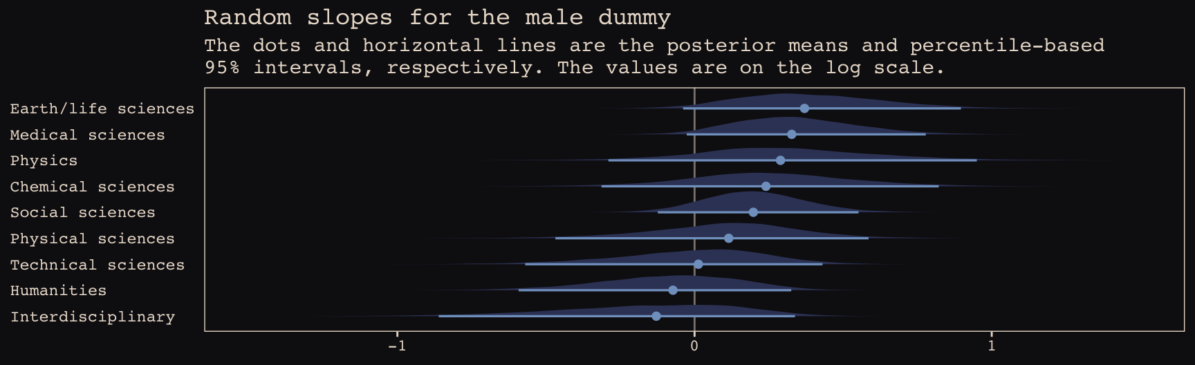 subtitle = "The dots and horizontal lines are the posterior means and percentile-based\n95% intervals, respectively. The values are on the log scale.",