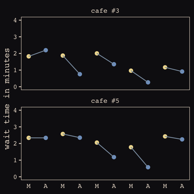 mutate(cafe = ifelse(cafe == 3, "cafe #3", "cafe #5")) %>%