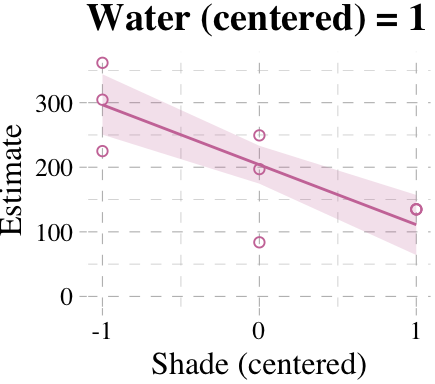 The plot tells a slightly different story, depending on whether you specify effects = "shade_c:water_c" or effects = "water_c:shade_c".