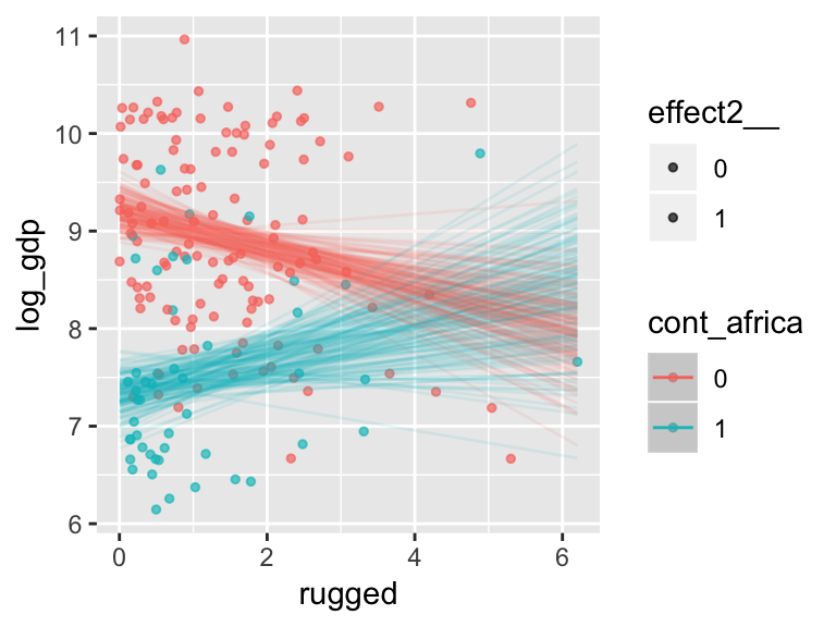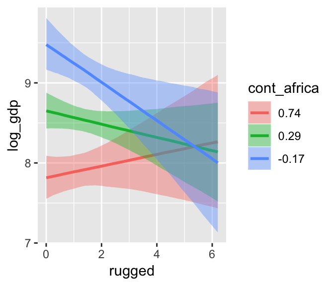 The marginal_effects() function defaults to expressing interactions such that the first variable in the term–in this case, rugged–is on the x axis and the second variable in the term–cont_africa, treated as an integer–is depicted in three lines corresponding its mean and its mean +/- one standard deviation. This is great for continuous variables, but incoherent for categorical ones. The fix is, you guessed it, to refit the model after adjusting the data.