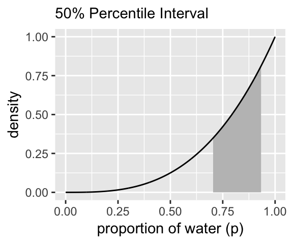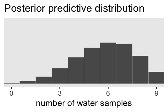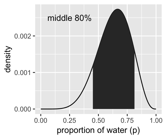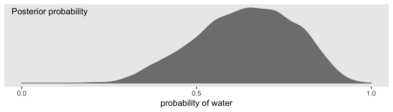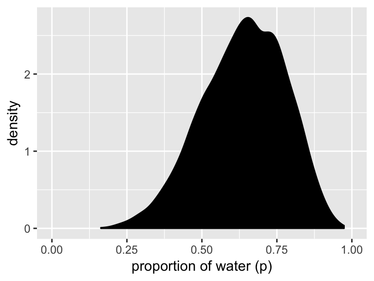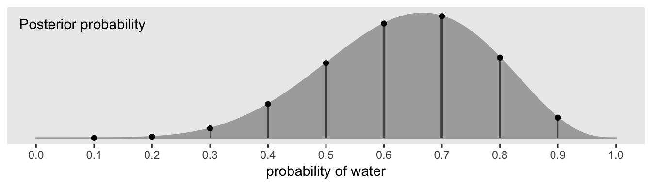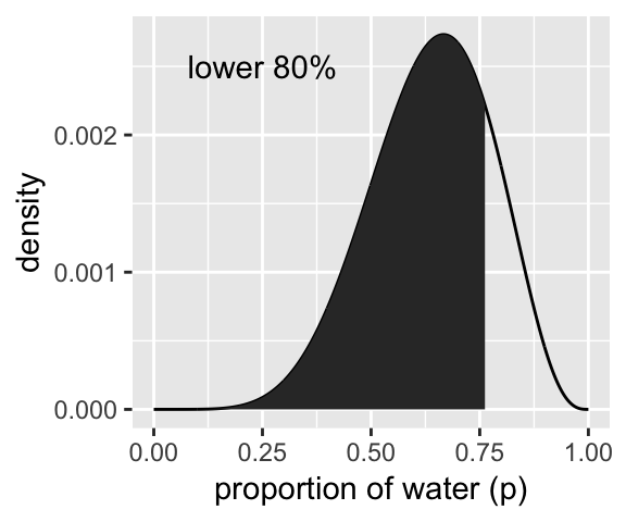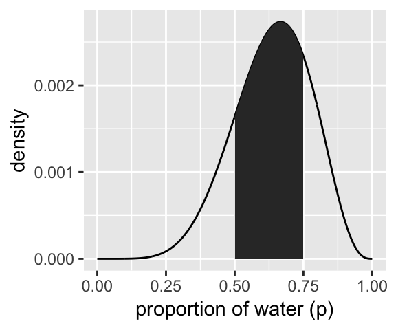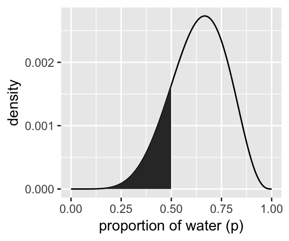 To get the proportion of water less than some value of p_grid within the tidyverse, you’d first filter() by that value and then take the sum() within summarise().