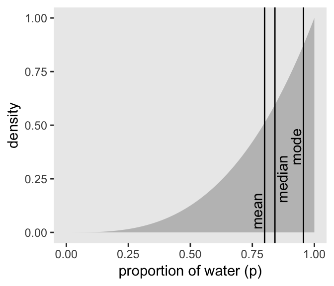 “Once your model produces a posterior distribution, the model’s work is done. But your work has just begun. It is necessary to summarize and interpret the posterior distribution. Exactly now it is summarized depends upon your purpose” (p. 53).