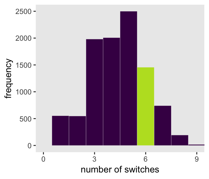 As you might imagine, we can use the output from fitted() to return disaggregated batches of 0s and 1s, too. And we could even use those disaggregated 0s and 1s to examine longest run lengths and numbers of switches as in the analyses for Figure 3.7. I’ll leave those as exercises for the interested reader.