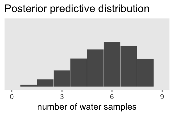 Looks a lot like the posterior probability density at the top of Figure 3.6, doesn’t it? Much like we did with samples, we can use this distribution of probabilities to predict histograms of w counts. With those in hand, we can make an analogue to the histogram in the bottom panel of Figure 3.6.