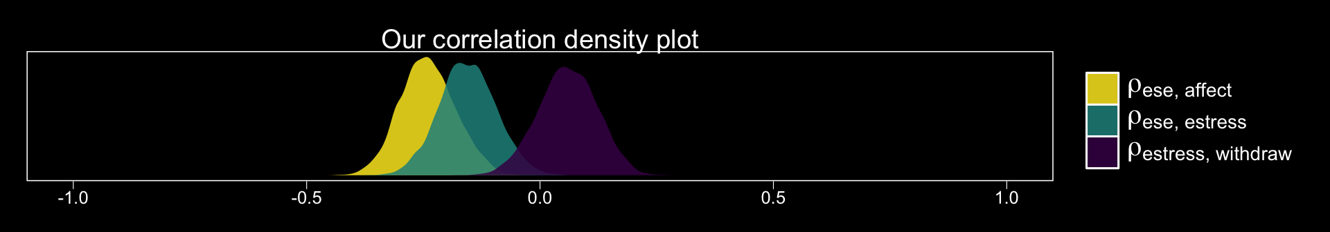 Since we have posteriors for the correlations, why not plot them? Here we use the theme_black() from brms and a color scheme from the viridis package.