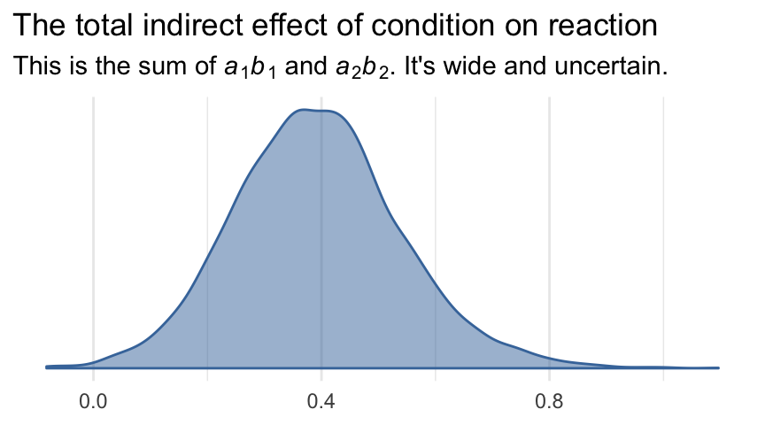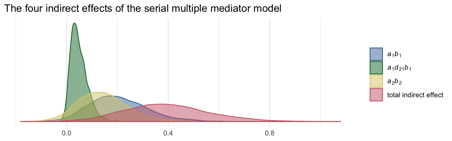 mutate(total_indirect_effect = a1b1 + a2b2 + a1d21b2)Anticipating the skew typical of indirect effects, we’ll summarize these posteriors with medians rather than means.