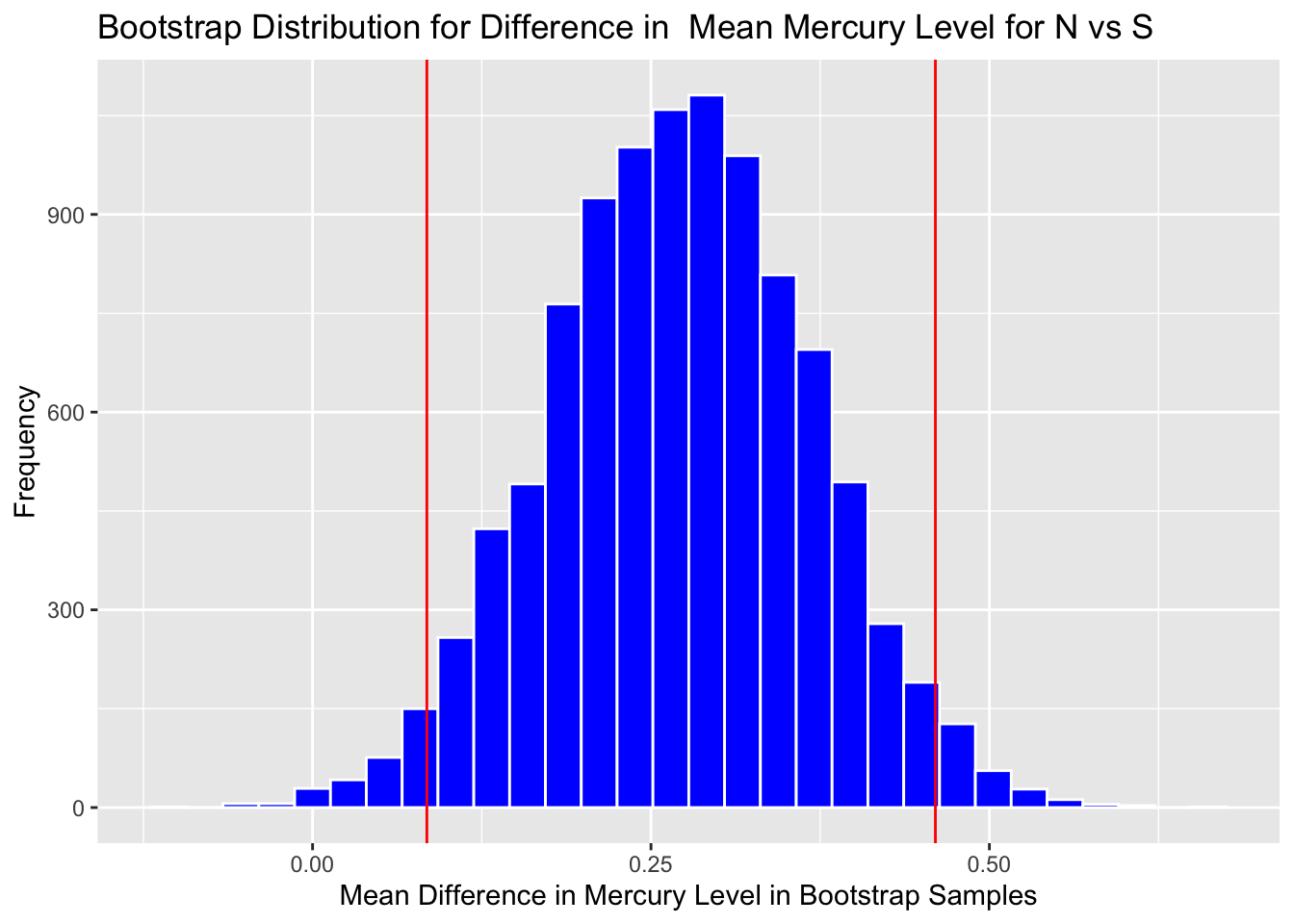 ggtitle("Bootstrap Distribution for Difference in Mean Mercury Level for N vs S")