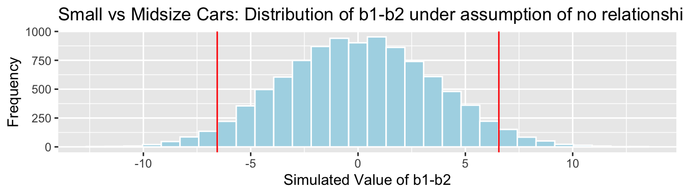 ggtitle("Small vs Midsize Cars: Distribution of b1-b2 under assumption of no relationship")