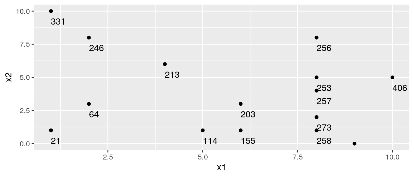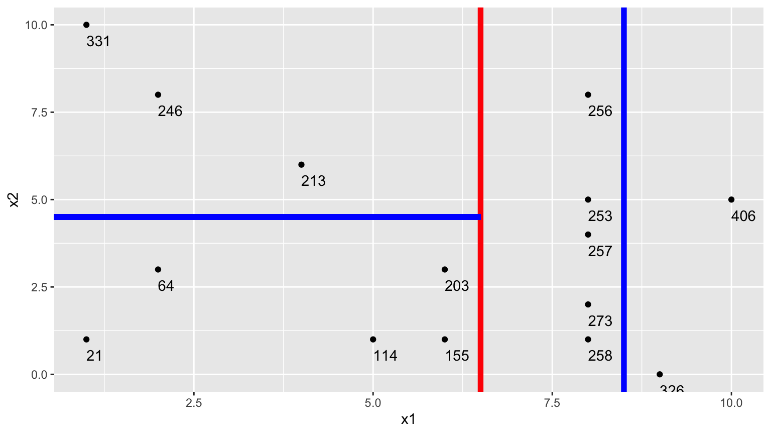 In fact, if we calculate all possible splits over \(x_1\) and \(x_2\), \(\displaystyle\sum_{i=1}^{n_L} (y_i -\bar{y}_L)^2 + \displaystyle\sum_{i=1}^{n_R} (y_i -\bar{y}_R)^2\) is minimized by splitting on \(x_1 < 6.5\)