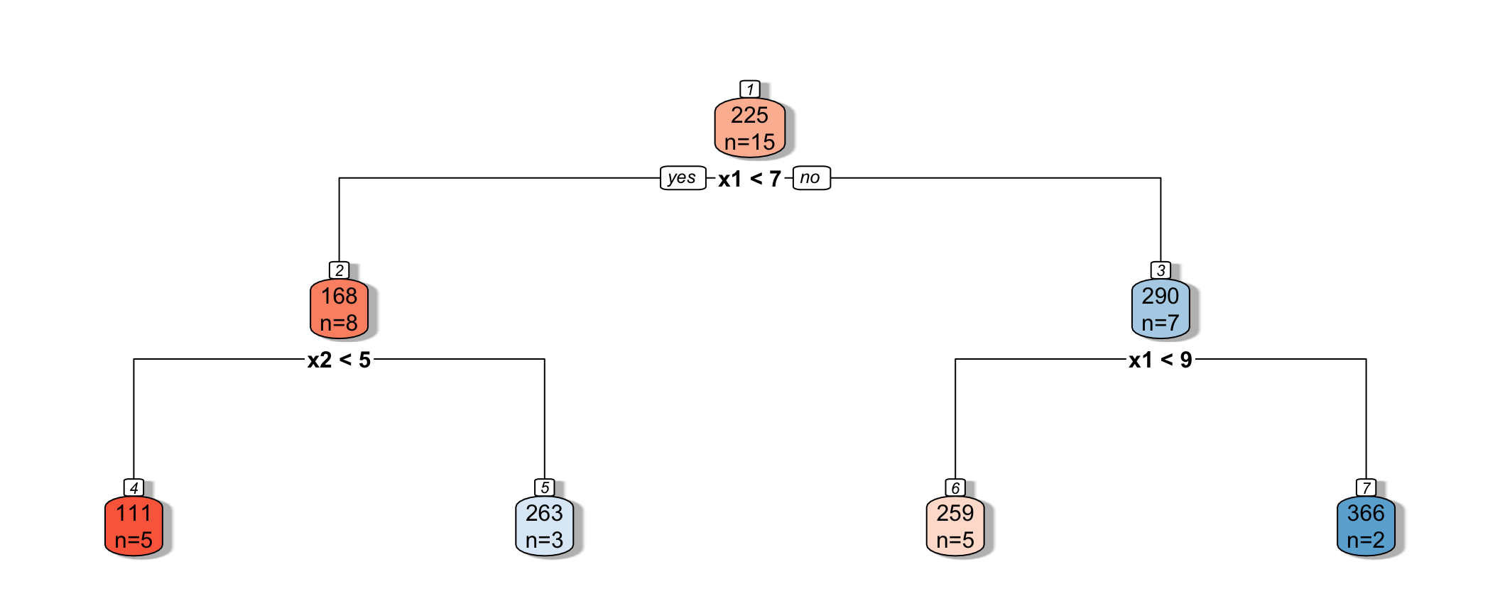 Of the three split’s we’ve calculated, \(\displaystyle\sum_{i=1}^{n_L} (y_i -\bar{y}_L)^2 + \displaystyle\sum_{i=1}^{n_R} (y_i -\bar{y}_R)^2\) is minimized using \(x_1 < 6.5\).
