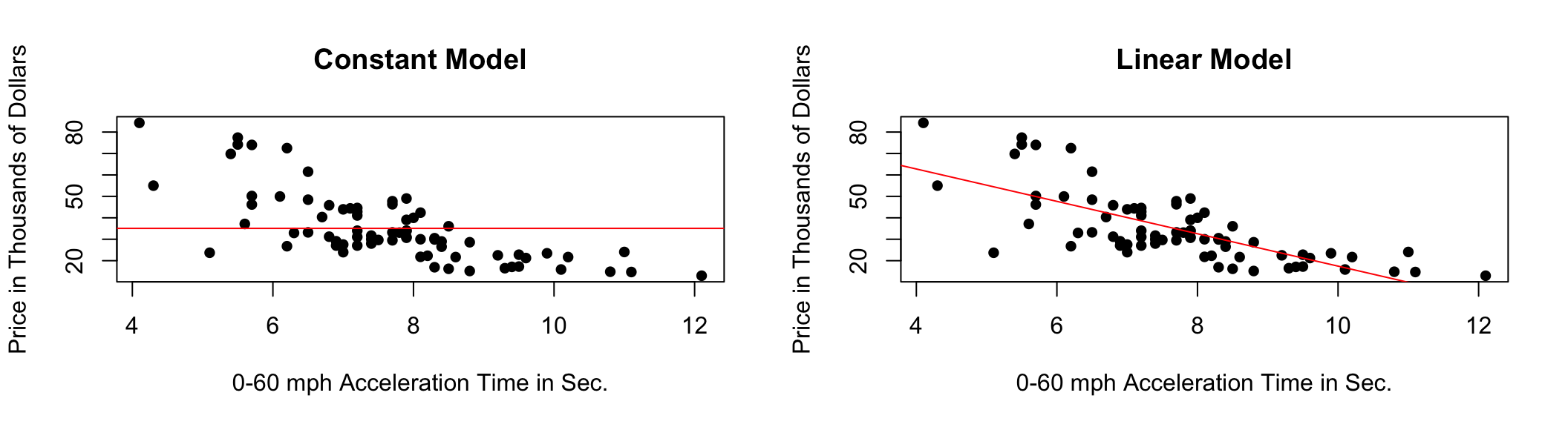 Not surprisingly the OLS model achieves smaller \(\displaystyle\sum_{i=1}^n (y_i -\hat{y}_i)^2\). This has to be true, since the OLS coefficients are chosen to minimize this quantity.