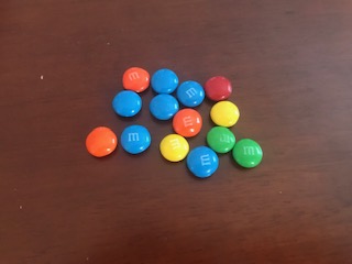 - Record the proportion of blue M&M’s in your sample of 14 in the spreadsheet, next to your name, and sample 1.