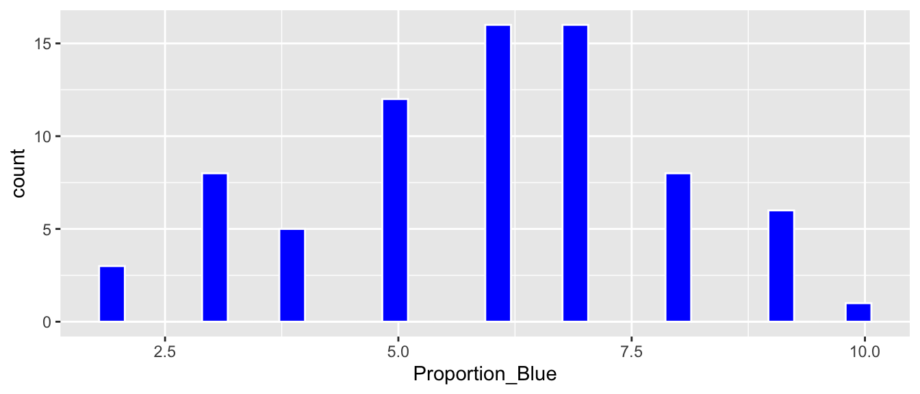 Although our results give us some sense of how much the proportion of blues could vary from one sample to the next, it would be better if we had LOTS of samples. We’ll use R to simulate doing this 10,000 times.
