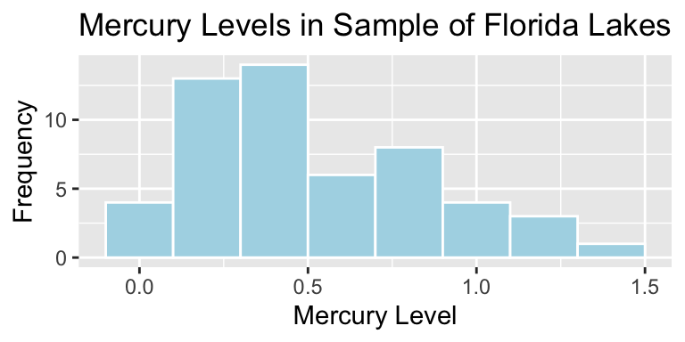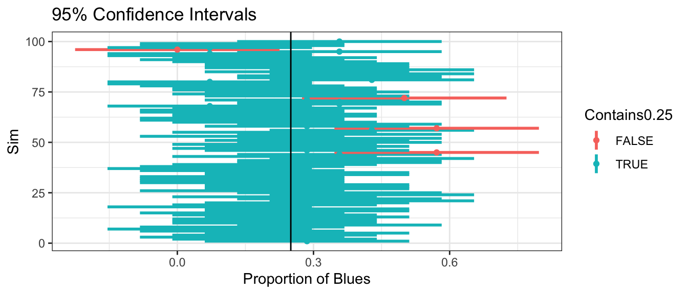 Using our sample, we estimate that the proportion of blues is \(\hat{p}=\frac{6}{14}\approx 0.429\).