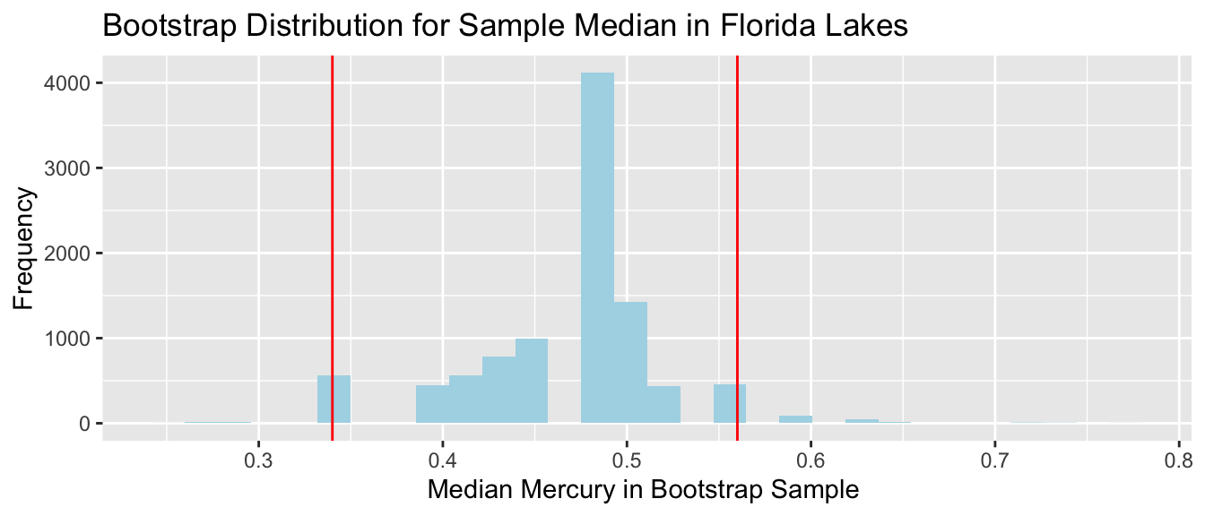 Based on our simulation, we are 95% confident that the proportion of blues among all M&M’s is between 0.35 and 0.5142857.