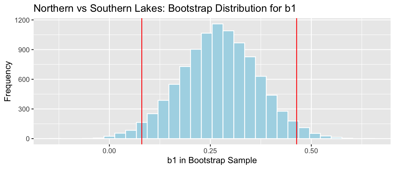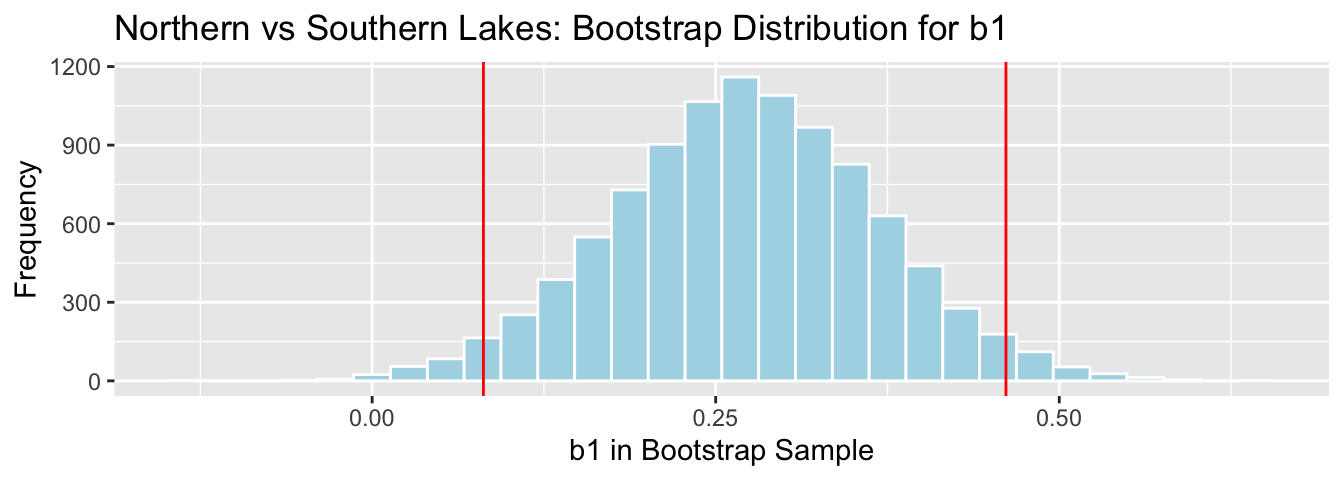 There is a considerable discrepancy between the percentile and standard error confidence intervals. Since the bootstrap distribution for \(b_1\) is not symmetric, only the percentile interval is reliable.