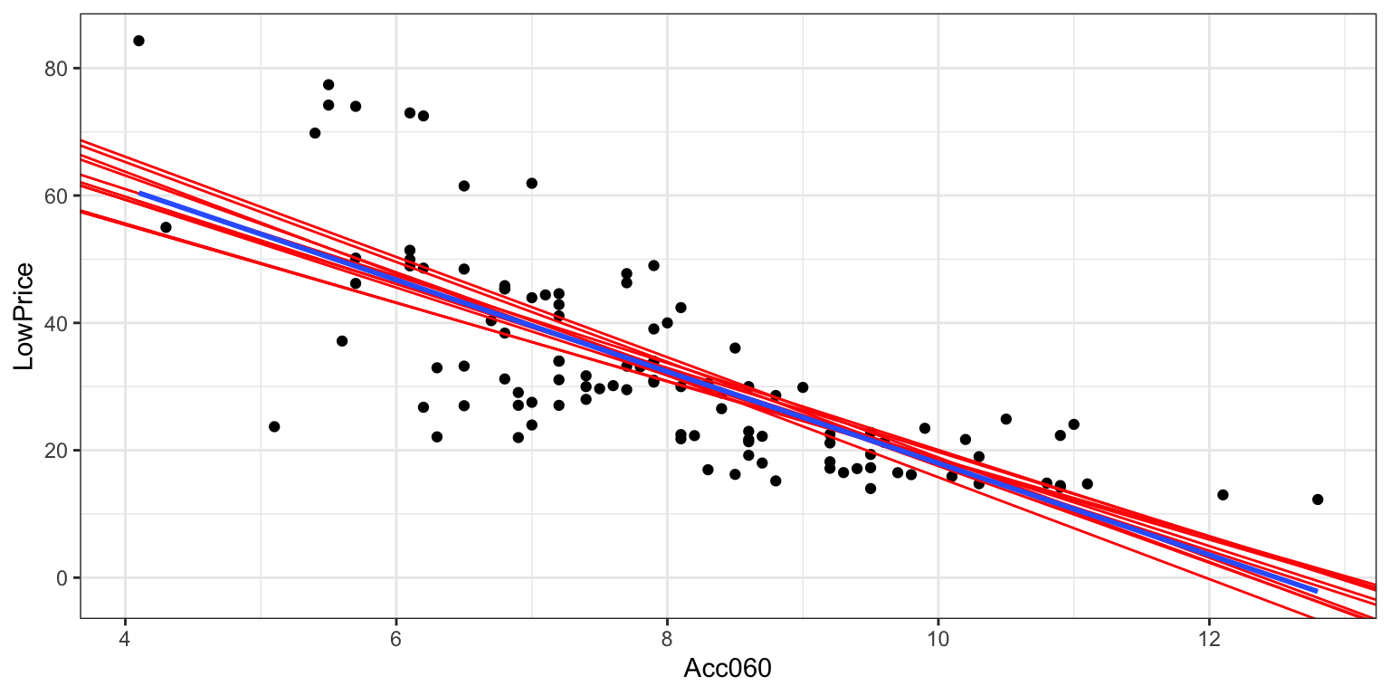 This model was fit using a sample of 97 wild bears. If we were to take a different sample, and fit a regression model, we would obtain different values for \(b_0\), \(b_1\), \(b_2\), and \(b_3\), as well as relevant quantities \(b_0-b_2\) and \(b_1-b_3\), due to sampling variability.