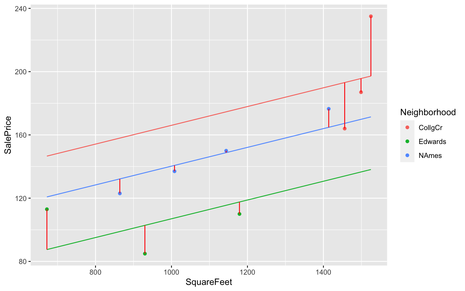 Now, suppose we know the neighborhood of each house. We can use this information to improve our predictions.
