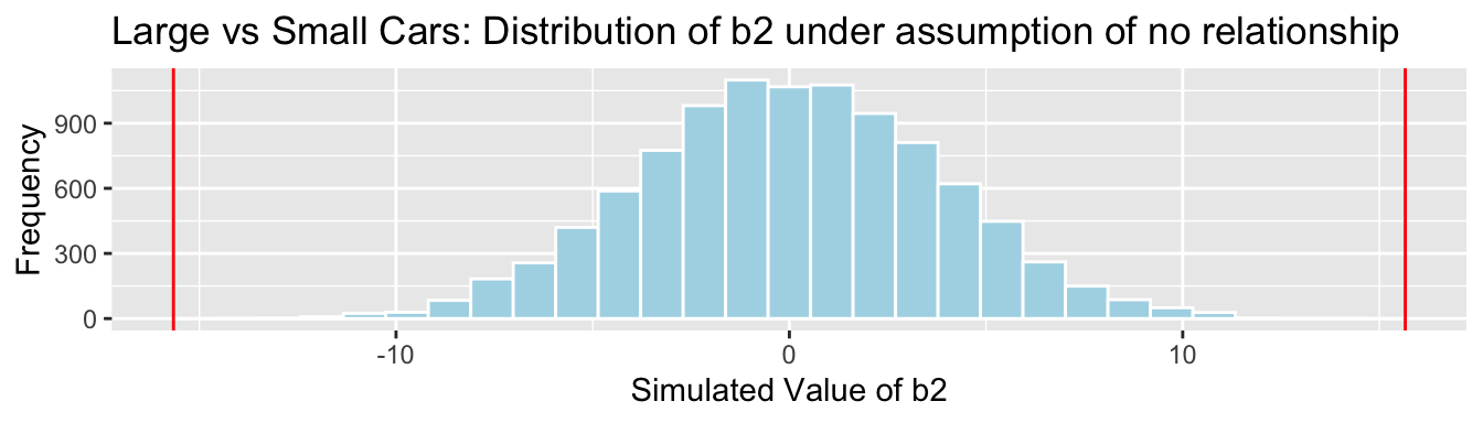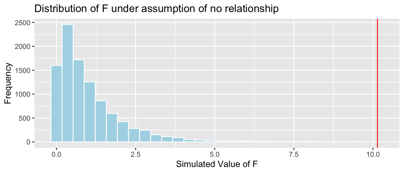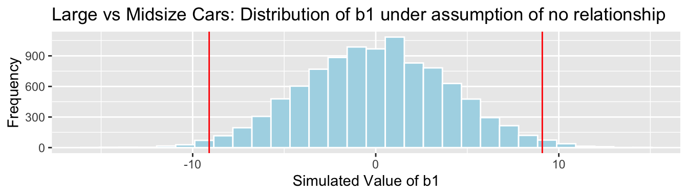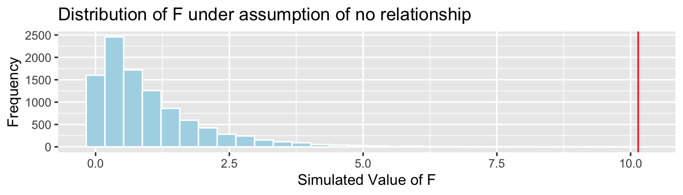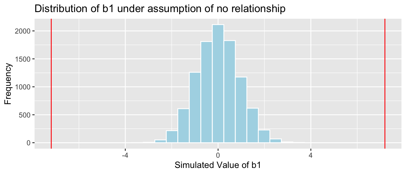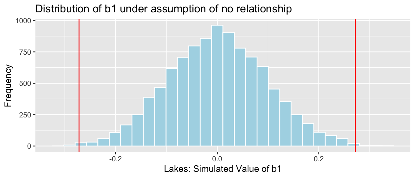 We’ll simulate situations where there is no relationship between location and mercury level, and see how often we observe a value of \(b_1\) as extreme as 0.27195.