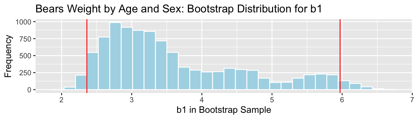 Repeat steps 1 and 2 many (say 10,000) times, recording the difference in means (i.e. value of \(b_1\)) each time.
