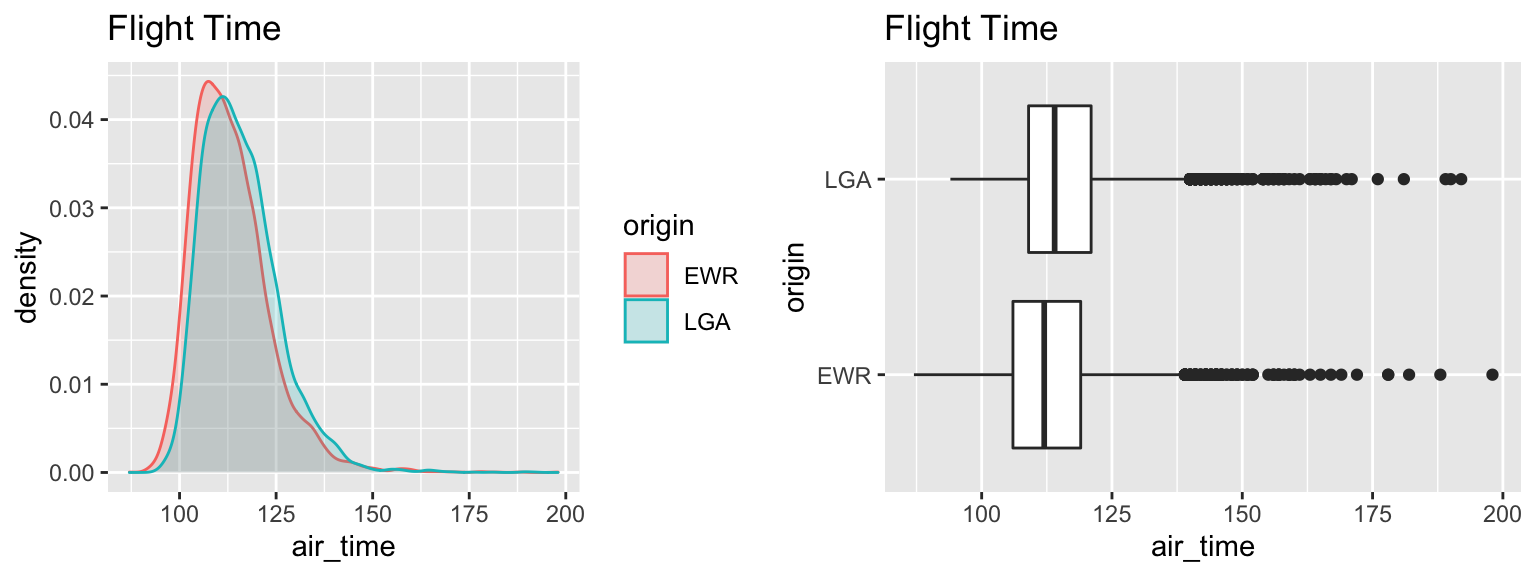 Although we have a low p-value, indicating a discernable difference, the size of this difference (2-3 minutes in airtime) is very small. A travelor would most likely have other, more important considerations when deciding which airport to fly from.