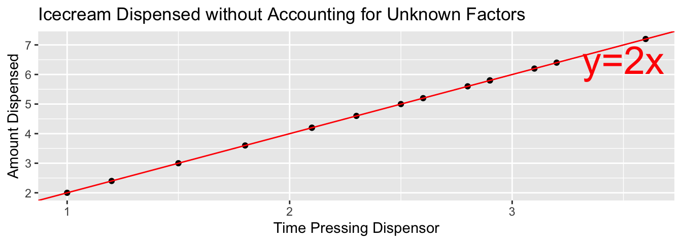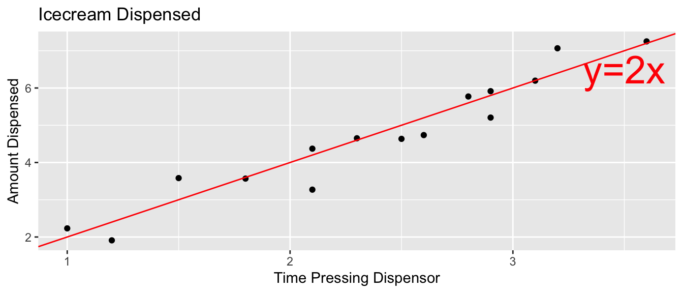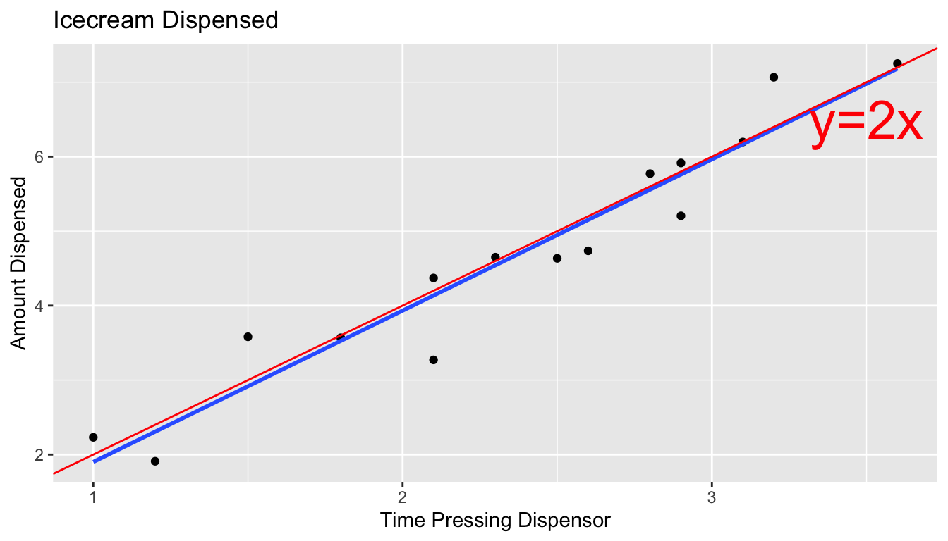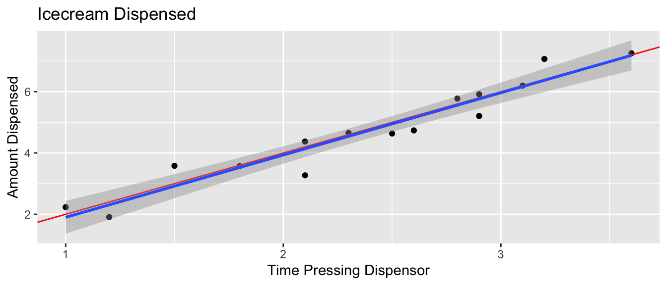 We know that these held true in the ice cream example, because we generated the data in a way that was consistent with these. In practice, we will have only the data, without knowing the exact mechanism that produced it. We should only rely on the t-distribution based p-values and confidence intervals in the R output if these appear to be reasonable assumptions.