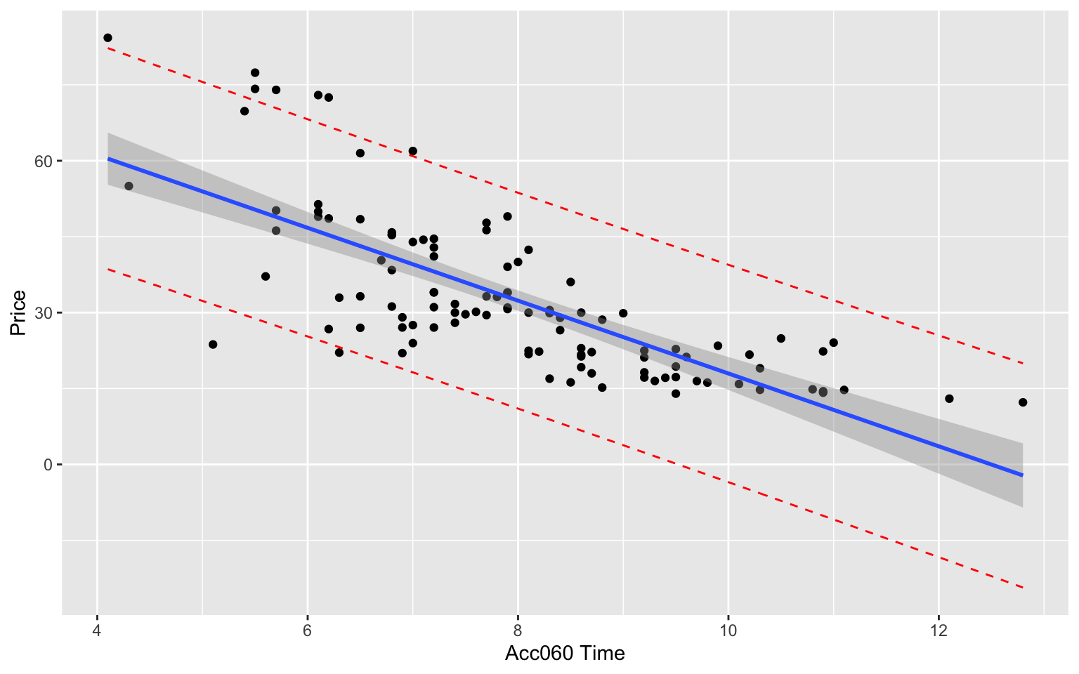 We are 95% confident that the expected price for a car that accelerates from 0 to 60 mph in 7 seconds is between \(e^{3.04} =20.9\) and \(e^{4.14}=63.9\) thousand dollars.